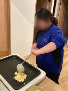 たまご割る時は、「そっとだよ」と声をかけ合い、慎重に行い、